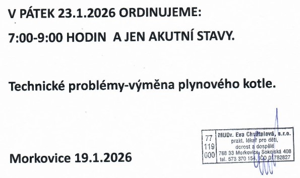 | Vážení pacienti, vzhledem k ošetření je nutno se před návštěvou zdravotního střediska objednat telefonicky na číslech: 573 370 154 nebo 605 186 636. Neobjednaní pacienti nebudou ošetřeni/ vyjma úrazu, život ohrožujícího onemocnění-dušnost , bezvědomí , masivní krvácení , křeče z horečky..../ RESPEKTUJTE ORDINAČNÍ DOBU PRO NEMOCNÉ !!!!!!!!!! Neplatí pro preventivní prohlídky a pro kojeneckou poradnu. Tito pacienti jsou pozváni na čas. Děkujeme za pochopení |